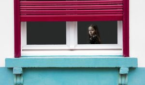 junge Frau sitzt hinter einem Fenster, man sieht das Haus von außen, rote Rolladen; sie sieht wuetend aus